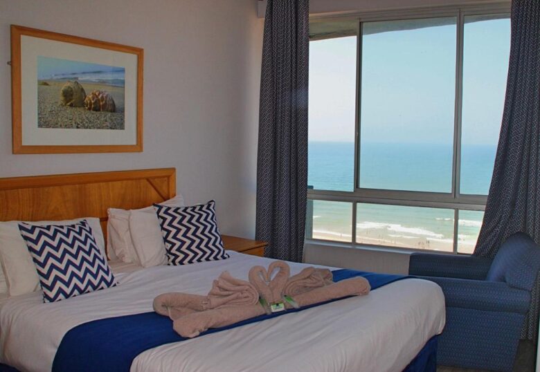 This unit comprises of a bedroom with either double or single beds. The sea-facing and air-conditioned living area has sleeper couches. There is a separate toilet and bathroom with shower over the bath.