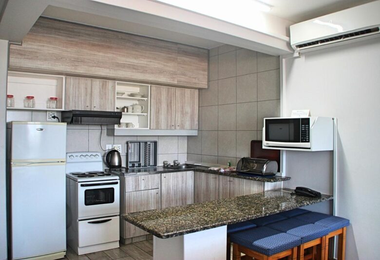 This sea-facing unit comprises of an air-conditioned living area with sleeper couch, a main bedroom with queen size bed and a smaller semi bedroom with bunk beds, suitable for children. The kitchen is equipped with a refrigerator